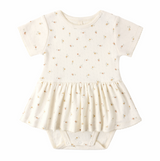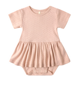 This short sleeve romper features a peplum skirt and sweet bow detail. Designed with shoulder and bottom snaps for easy changes.