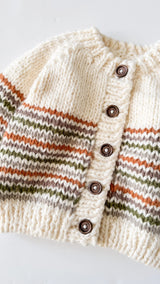 Wander through the woods with the little adventureres in our Woodland Stripe Cardigan. This Cream cardigan features stripes of our Clay, Flax, Moss, and Tan colors.