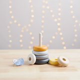 - A fun wooden stacking toy for toddlers with a charming bee color theme for each piece. Stacking toy puzzle includes six stacking pieces that stack on wood base. Another adorable addition to our exclusive Happy + Bright Collection. Packaged in shrink wrap. The Bee Rings stacking toy is recommended for ages 18 months and older.