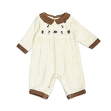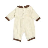- Floral embroidered & corduroy trimmed peter pan collar jumpsuit in crinkled muslin fabrication, cream base with earth brown trims.
